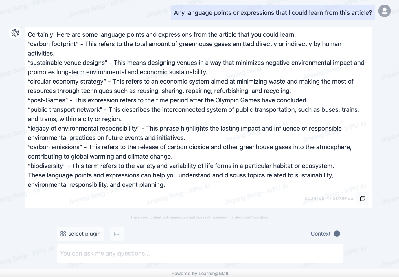 在跨国教育环境中,特别是对以英语作为第二语言的学生而言,语言因素尤为关键。在EMI环境下,学生需掌握特定的学术语言,而这对许多学生来说是一个较大的挑战。尽管GenAI工具普遍提供语言支持,XIPU AI在帮助学生应对课程的特定学术语言要求方面尤为有效。该工具不仅帮助学生理解学科特定术语,还提供了与上下文相关的语言支持,对那些需要在多元文化与学术身份间平衡的学生而言尤为宝贵。这种支持有效减少了语言障碍,为学生的跨文化学术适应提供了帮助。