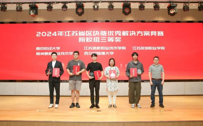 2024年6月24日,由江苏省区块链发展协会主办的2024南京软件大会“区块链+数据要素”赋能高质量发展论坛在南京成功举办。来自西交利物浦大学智能工程学院的李万鑫、张杰老师及其学生团队凭借在区块链技术领域的杰出贡献,荣获2024年江苏省区块链优秀解决方案竞赛三等奖,这是我校首次在该类竞赛中荣获奖项。