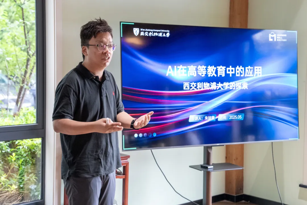 在分享环节中,西浦学习超市教育技术组及技术研发组负责人朱喆斐(下图)介绍了西浦自主研发的AI教育平台“君谋”的多个应用场景与实践经验,深入分析AI在教育、科研与管理等方面的应用实践与未来趋势,并强调AI素养对于教师群体的重要性。