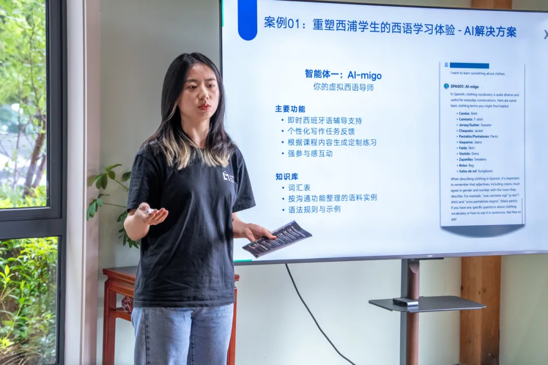 第一期“西浦AI赋能教育”创新大赛宣发负责人宋静怡(下图)介绍了“西浦AI赋能教育”创新大赛中的优秀案例,涵盖语言教学、项目管理、编程实践等多个学科,充分展现了AI在多样化教学场景中的应用潜力。