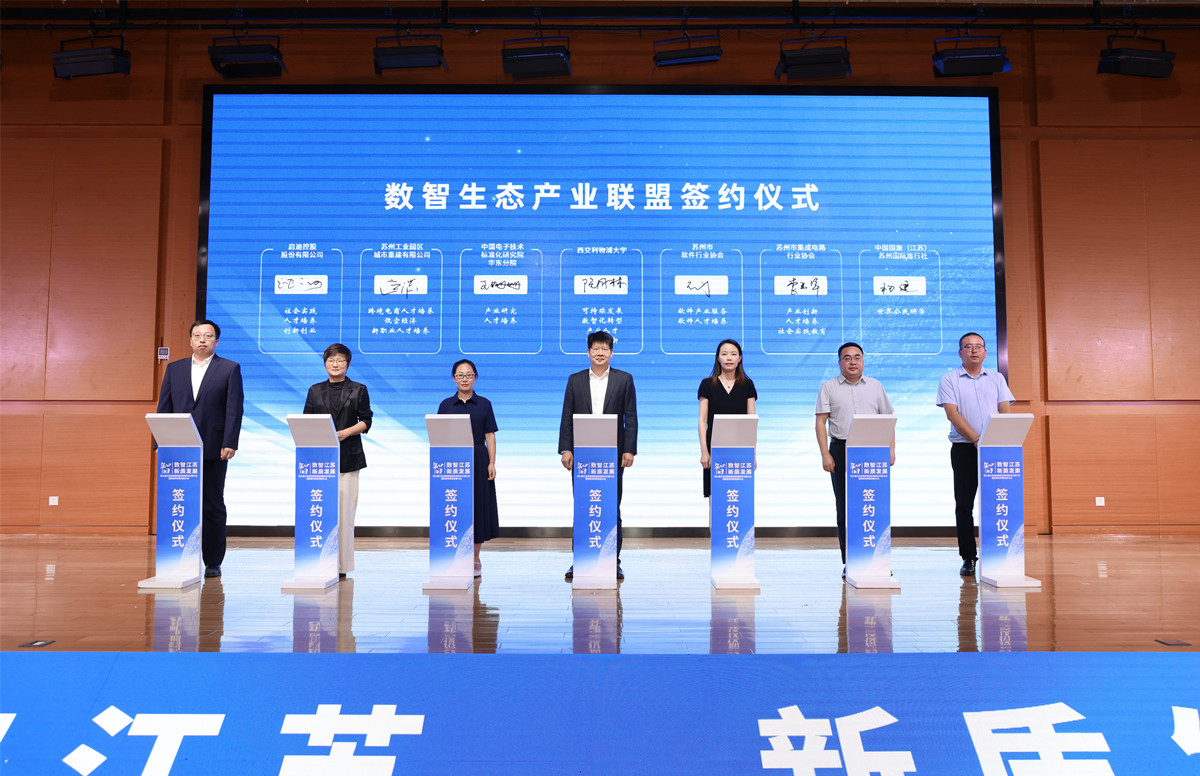 为进一步推动智能制造产业与数字经济的融合发展,大会期间有多个重要项目签约落地。其中,西交利物浦大学、中国电子技术标准化研究院华东分院、苏州市软件行业协会、启迪控股、苏州工业园区城市重建有限公司、苏州市集成电路行业协会和中国国旅(江苏)苏州国际旅行社有限公司,共同签署了数智生态产业联盟合作协议。西浦副校长阮周林教授(下图左四)表示,在联盟合作的基础上,西浦将进一步深化“产学研创训”的融合发展,以生态平台促进资源的聚合与共享,推动区域产业生态的共建共赢。